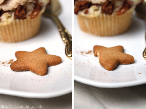 Wie gesagt: der Kuchen ohne Topping ist schon sehr fein. Der Kuchen mit Topping ist superfein und der Kuchen mit Topping UND Keksdeko ist einfach nur mmmmmhhhhh! Die Törtchen sind soooo lecker und sie eignen sich einfach perfekt dazu, sie auf einer hübschen Tortenplatte vor dem Weihnachtsbaum zu drapieren und ein paar Fotos mit hübschem Bokeh im Hintergrund zu schießen. Wer keinen Weihnachtsbaum hat, aber trotzdem hübsches Bokeh im Hintergrund haben möchte, kann sich mit einer Lichterkette, die er über einen Stuhl drapiert behelfen, aber psssst.